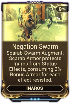 Once launched toward the targeted enemy, Scarab Swarm infests all enemies in its path on contact. Swarmed enemies will flail in panic and receive 100 / 150 / 175 / 200Corrosive damage per second for 6 / 10 / 12 / 15 seconds, during which they are completely disabled. Each swarm host generates an aura with a 6 / 10 / 12 / 15 meter radius that converts the damage dealt by Scarab Swarm into health points for Inaros and his allies in range. Scarab Swarm can spread all of its effects to any unaffected enemies within a 5 meter radius from a swarm host for 100% of its remaining duration.