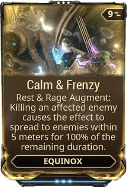Calm & Frenzy is a Warframe Augment Mod for Equinox that aids her in spreading the effects of Rest & Rage. Enemies slain while affected by Rest & Rage spreads it to others within close proximity, for the remaining duration.
