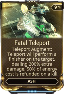 Fatal Teleport is a Warframe Augment Mod for Ash that causes Teleport to immediately perform a melee finisher upon teleporting to the target, with an additional damage multiplier. Additionally, if the finisher kills its target, 50% of Teleport's energy cost is refunded.