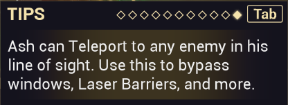 The Tips for Teleport in Ash's preview screen show that it can be used to get to any of its listed targets as long as there is Line-of-Sight, but as of now that does not work. It will simply say, "Target Obstructed", or, "Invalid". Can be seen on the character page for Ash toward the end of tips.