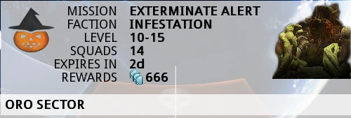 The Halloween 2014 Alert was a special alert that became active from October 31, 2014 to November 3, 2014. Taking place on Oro, Earth, this Infested Extermination mission featured dense fog that severely limited visibility, as well as a number of other special additions. This alert also featured an optional objective in the form of Grineer Resource Caches hidden throughout the map that can be found for additional rewards. Unlike normal Alert missions, this special alert can be replayed after completion for the duration of the alert.
