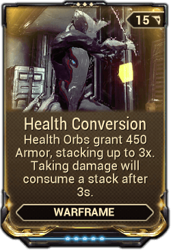 Health Conversion is a Warframe mod that grants additional Armor for every Health Orb picked up, up to a maximum of 3 stacks of bonus armor. Taking health damage when a stack is present will consume 1 stack after a 3 second delay.