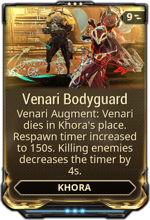 Slash), her finalized kit was showcased on Devstream 109 with the dependency on damage types removed and a new behavior mode selection feature for Venari was introduced instead. - Khora is the first Warframe to ever require Kavat Genetic Codes, due to Venari being a Kavat, and the first Warframe to require Kuaka Spinal Claw, possibly due to her connection with the Plains of Eidolon mentioned in the Ghoul Fragments.