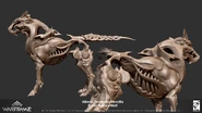 Appearance-wise, the Krubies both bear a resemblance to Kubrows and the ancient wolves of pre-Orokin Earth. Like most of Duviri's animals, the Krubies' heads are skull-like, devoid of eyes and most flesh. They have tails of solid bone.