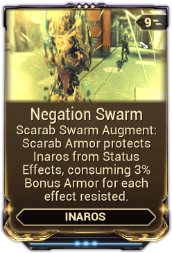 - Negation Swarm has been replaced by Negation Armor: When Inaros takes fatal damage, consume Scarab Shell to heal and become briefly invulnerable. Inaros is affected by a strong Bleed Status when this ends.