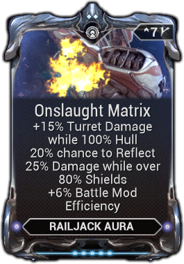 Onslaught Matrix is a Plexus Aura mod that provides an increase to turret damage with 100% hull, a 20% chance to reflect damage when over 80% shields and Battle mod efficiency.