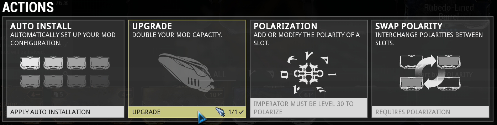 To apply an Orokin Catalyst, go to the Arsenal and access the desired item's Mod loadout. Select Action at the bottom of the screen and select Upgrade.