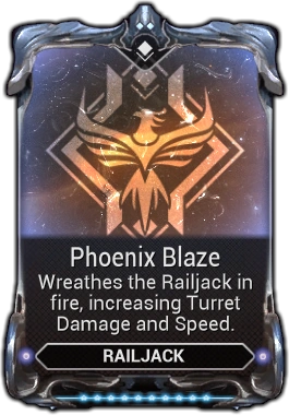 Phoenix Blaze Wreathes the Railjack in fire, increasing Turret Damage and Speed. Introduced in Update 29.10 (2021-03-19) |