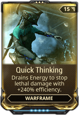 Quick Thinking is a mod that uses the Warframe's residual energy pool as an emergency buffer to prevent death whenever a player drops to 2 Health.