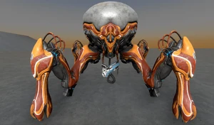 Scyto Raknoid is a medium-sized Raknoid creature found in the Orb Vallis that only spawns at Alert Level 4 via Reinforcement Beacons. The sac on its back stores a glue-like fluid, which it uses for a variety of attacks. Aside from a basic ranged stream, it is capable of covering a large area, slowing enemies. Further, it can use a grappling hook to pull enemies close, whereupon it deploys a tethermine that immediately attaches to the target. It can also detect invisible players via a white radial ring that emits whenever an invisible player is nearby, allowing it to attack invisible players.