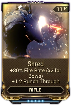 Shred is a mod that increases the fire rate of rifles and bows by 5% and punch through by 0.2 meter per rank for a maximum of 30% and 1.2 meter at Rank 5, respectively.