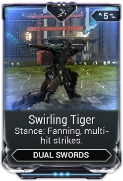 Swirling Tiger is a stance mod for Dual Swords type weapons. Its sweeping attacks specialize in dealing damage across multiple foes.