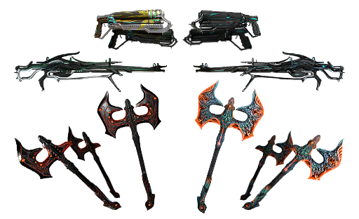 Alamos Sniper • Anpu Staff • Ascension Speargun • Astreos Sword and Shield • Avex Sniper • Blodgard Heavy Blade • Boltor Bravura • Dryad Bow • Cirriped Epitaph • Clavatus (Heavy Blade , Ignis , Zarr ) • Carcinus Speargun • Causta Bow • Ceramica Tonfa • Daecret Tonkor • Dagger Axe (Dual Zoren , Scindo ) • Dali Ballistica • Deimos Claw • Dendrite Gunblade • Dex Pixia (Aerospri , Hawkmoth ) • Diode Hammer • Diwata (Hawth , Mot )• Dreyric Fist • Dominion Heavy Blade • Cyskis Dual Swords • Nari & Vali Dual Swords • Flamethrower Plazm • Fragor Brokk • Frysta Sword • Palatine Hammer • Harmatt Sparring • Hecaton Shotgun • Kopesh Longsword • Scindo Manticore • Maruta Tonfa • Meteor Whip • Monitivus Thrown Weapon • Mortier Heavy Blade • Motherwrench Hammer • Nidoblast Kompressa • Dax Nikana • Ryu Nikana • Oku Nikana • Orison Two-Handed Nikana • Pandero Ceramica • Perla Pistol (Dual ) • Proto-Glaive • Privolv Fulmin • Rashasi Polearm • Renok Hammer • Renuntio Speargun • Rephrax Longsword Skin • Ringers Skin • Sonicor Cliona • Sonicor Festive Skin • Spearmint Scythe • Volu Staff • Danaus Sword and Shield • Tarock Thrown Blade • Tecton Sparring • Teng Dagger • Thanatos Scythe • Verta Warfan