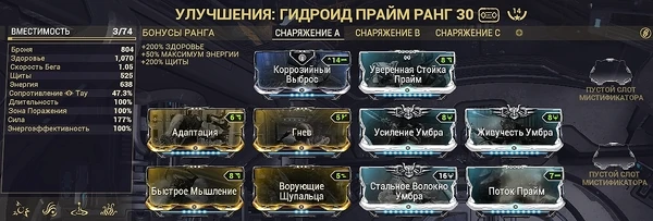 Adaptation is a mod that gradually increases resistance to received damage types, up to 90%. Adaptation, for us, is very useful, because Hydroid Prime, with all Umbral mods, will have - 804 armor, which is 72.8% damage resistance. With Adaptation, resistance will rise to 81.8%, at 90% resistance to certain damage. But, adaptation is not a panacea, because against strong single damage, it will not work. This is exactly what the Vambac, in the Veil Proxima, and the Corrupted Bombard, in the Void MOT, on The Steel Path are terrible for.