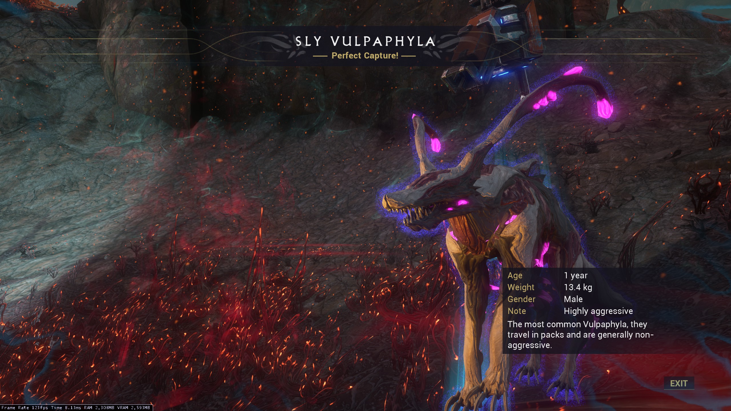 A rare Vulpaphyla subspecies that only appears during Fass. Due to the hostile environment of Deimos and the Cambion Drift, the Panzer Vulpaphyla's skin has evolved to become more thick, acting like natural armor plating, requiring 3 tranq shot to fully subdue.